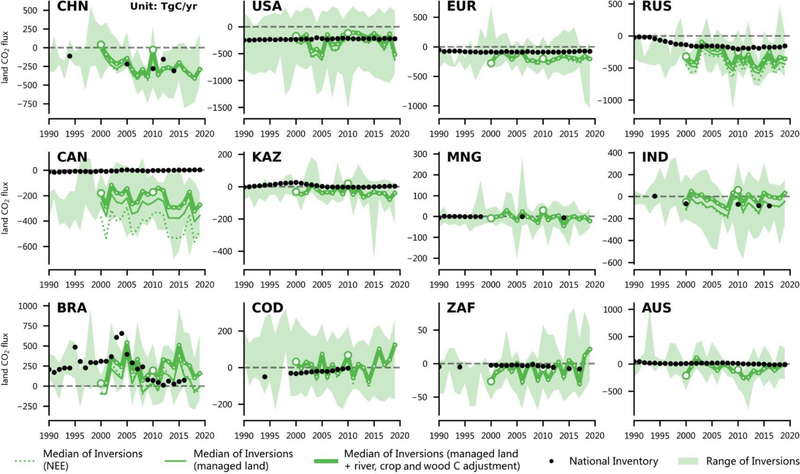 Net ecosystem exchange (NEE) CO2 fluxes (Tg C yr−1) By convention, CO2 removals from the atmosphere are counted negatively, while CO2 emissions are counted positively. The black dots denote the reported values from NGHGIs. The thick solid green lines denote the median of land fluxes over managed land of all CO2 inversions, after adjustment of CO2 fluxes from lateral transport by rivers and crop and wood trade. The thin solid line is the median of inversions over managed land and without lateral transport adjustment. The dotted line is the original median of inversions, where the large hollow dots in the line are for years beginning a decade and small hollow dots are for other years. Light green shading is from the min–max range of inversions.