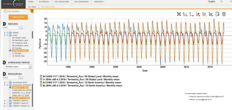 The land-surface CO2 fluxes from the five inversions and 14 dynamic global vegetation models from GCB2018 (Le Quéré et al. 2018) can now be explored in the Global Carbon Atlas: