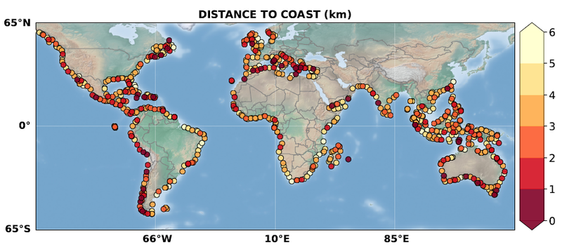 Then, further validation and editing have led to the production of the v2.1 dataset of monthly sea level anomalies and associated trends at 756 selected coastal sites located in almost all the world coastal ocean (see below) covering 2002-2020.