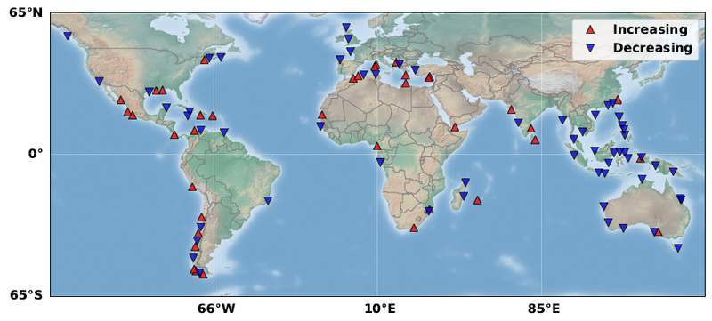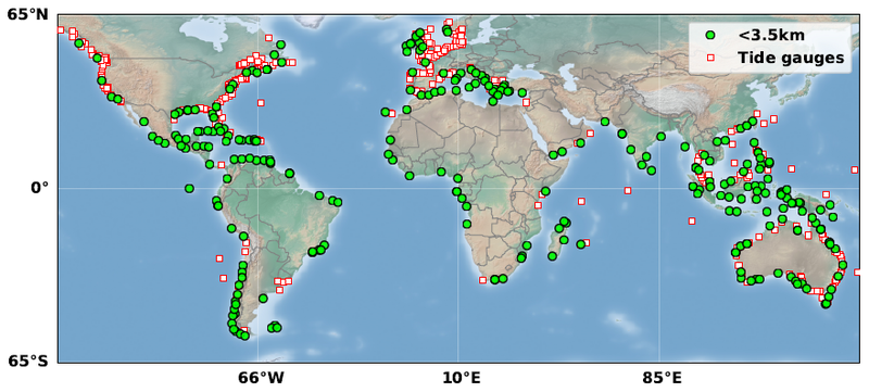 The network of virtual coastal stations proposed here should be of invaluable interest for estimating present-day (absolute) sea level rise along the world coastlines, especially in regions devoid from in situ tide gauges. This is illustrated below with the distribution of the 271 virtual stations located within 3.5 km from the coast and of current tide gauges that have monthly sea level data over the study time span (with not more than 24 months of missing data).