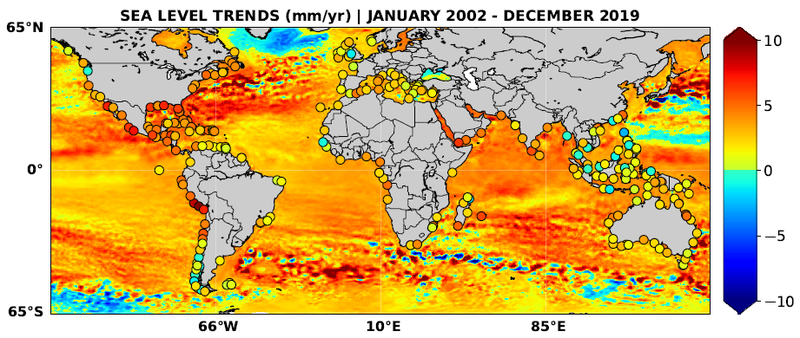 The global mean level of the oceans is an indicator of climate change. It incorporates the reactions from several different components of the climate system. Precise monitoring of changes in the mean level of the oceans is vitally important for understanding not just the climate but also the socioeconomic consequences of any rise in sea level.
