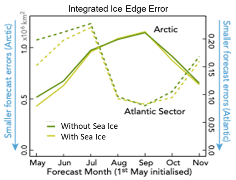 Assimilating sea ice concentrations (SIC) reduces forecast errors in Arctic sea ice extent, particularly from May to July (Figure 1). These improvements are most noticeable in the Atlantic sector with increased skill in forecasting sea surface temperature (SST). This improvement is explained through a more realistic teleconnection mechanism with ice in the Labrador Sea. Improved SSTs persist over summer leading to better prediction of the large-scale atmospheric circulation. The better circulation forecast then leads to improvements in the prediction of surface temperature and precipitation in Eurasia.