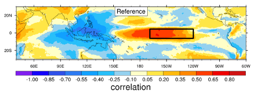 The phases can be classified by calculating SST anomalies for different regions of the Equatorial Pacific, most typically the Niño3.4 region as marked in Figure 1. The figure shows the correlation between CCI SST Niño3.4 index and CCI global cloud cover (CLT). The warm El Niño phases are accompanied with deep convective clouds in the central or eastern Pacific and reduced cloudiness in the western Pacific. The maximum positive correlation is for the mid Pacific shifted west of the Niño3.4 box.