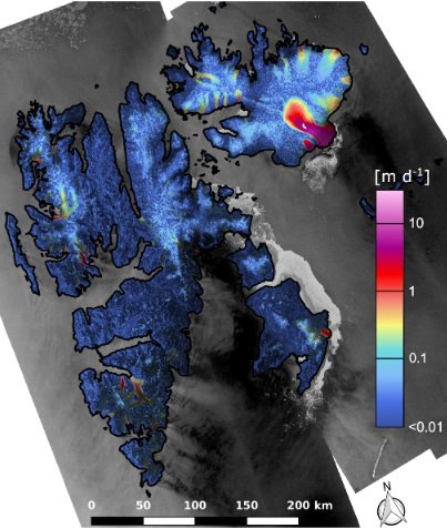 Figure 1: Glacier velocity in Svalbard derived from Sentinel-1 data. Image credit: contains modified Copernicus Sentinel-1 data (2016), processed by ENVEO.