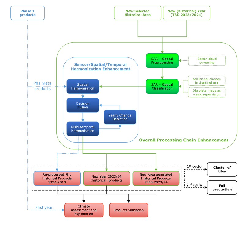 - Historical products re-processing: generation of an improved version of historical products by enhanced sensor decision fusion and spatial and temporal harmonization.