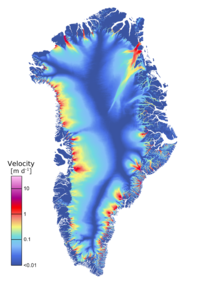 Ice velocity is provided as gridded velocity fields (maps) in NetCDF format with separate files for x and y velocity components (in m/d). The velocity represents a mean velocity value over a time period ranging from the time span of the satellite repeat cycle (between 1 to 46 days) to a full season or year for the ice sheet-wide velocity maps.