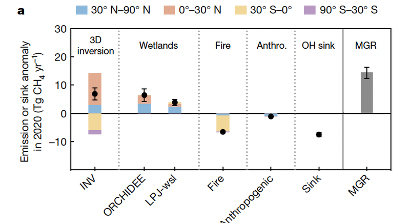 Methane emission and sinks of four latitudinal bands. The black dots show net changes in global CH4 emissions between 2020 and 2019. MGR = methane growth rate.