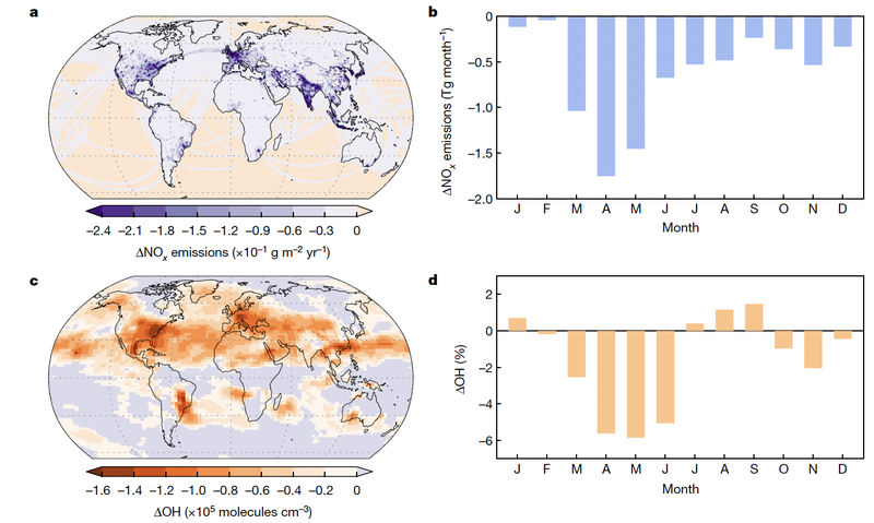 Using fossil fuel combustion data, chemistry transport models and 3D atmospheric models of methane, the team detected a drop in tropospheric OH concentration in 2020. This was due mainly to lower anthropogenic NOx emissions. In turn, global methane removal from reaction with OH decreased by around 7.5 Tg CH4 yr−1, contributing 53 percent of the emissions spike.
