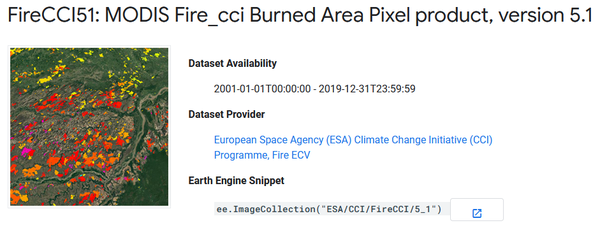 We are glad to announce that the FireCCI51 burned area pixel product, based on MODIS reflectance at 250 m resolution, has been added as an official product in the Google Earth Engine catalogue.